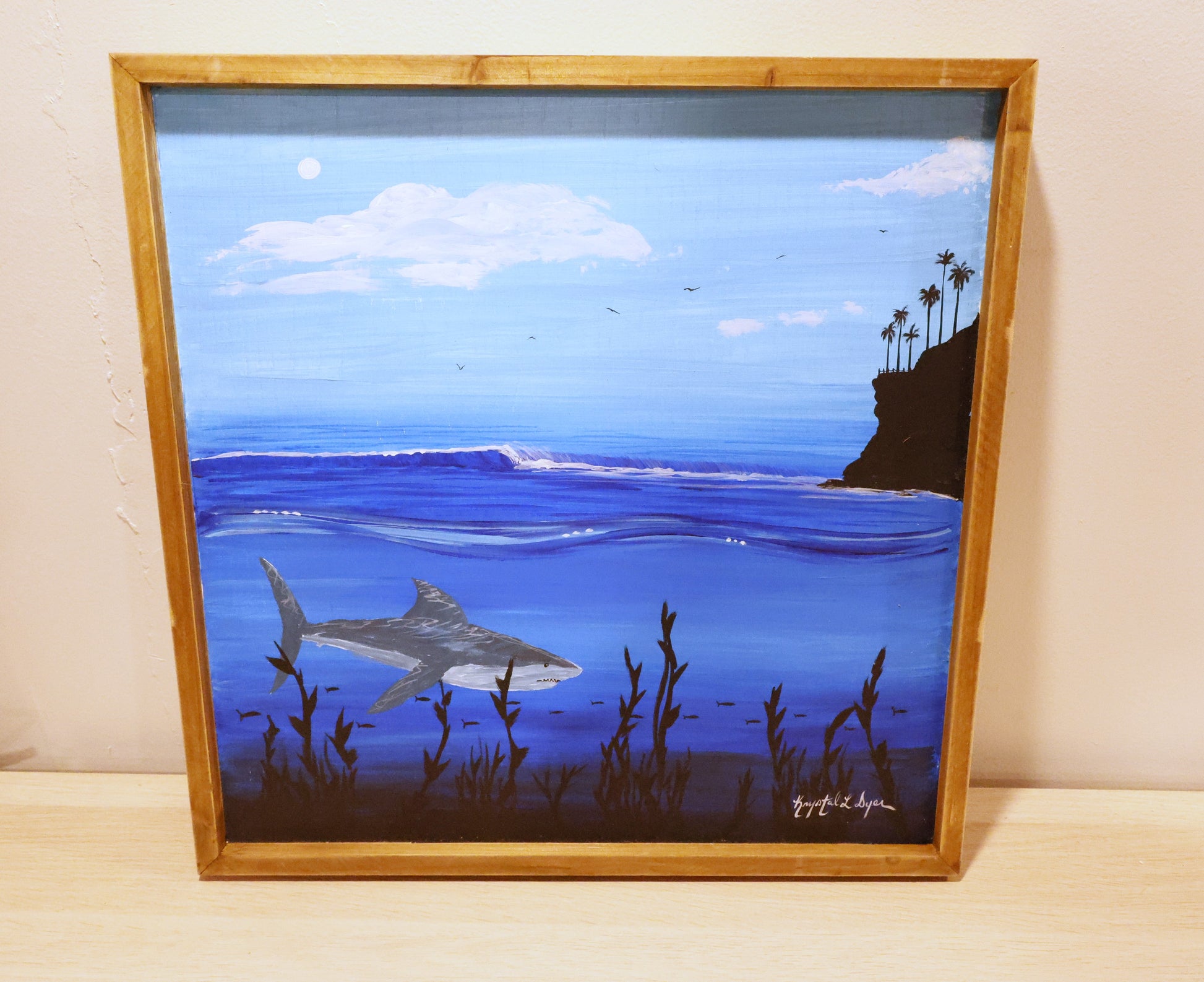 19 ¾ x 19 ¾ inches acrylic on wood painting. Painted live by Krystal L. Dyer on October 14, 2023, during “Rebel Shakedown” at the Baja Roots Festival in Rosarito, Mexico. A striking underwater view of a great white shark gliding through ocean kelp, with waves rolling above and a coastal cliff lined with palms under a bright sky. Framed and signed by the artist.